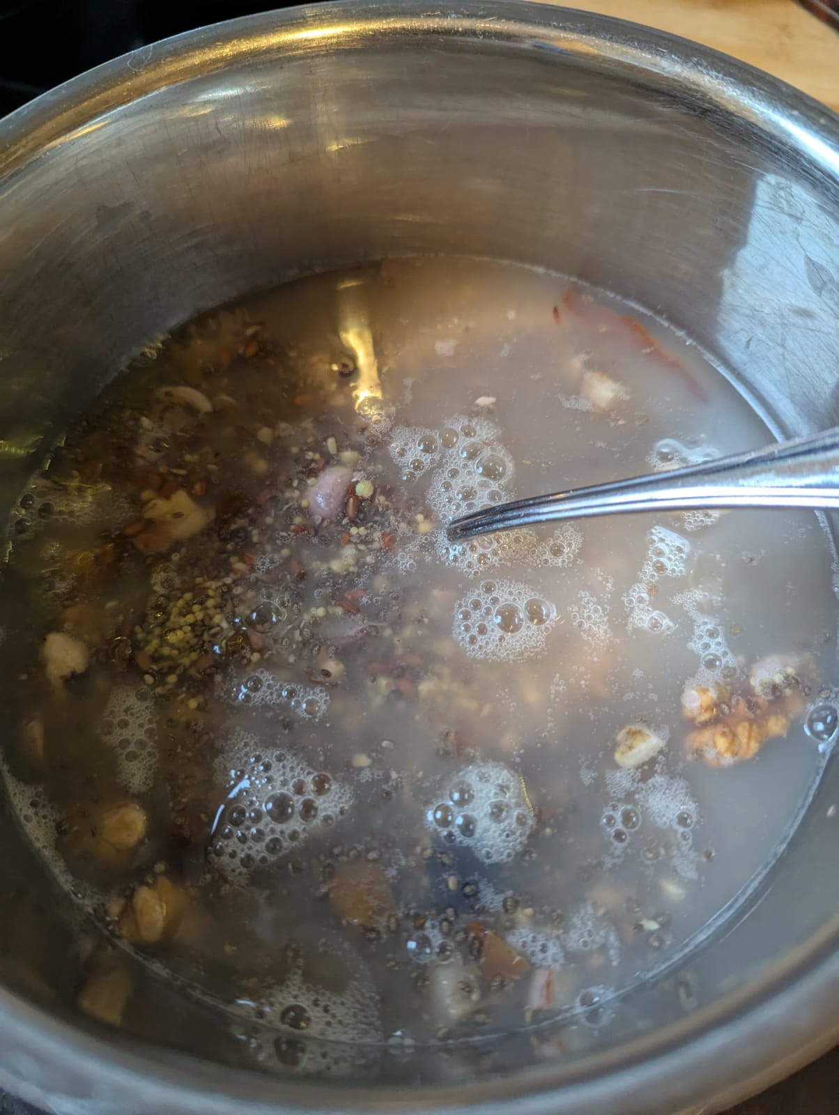 Endlich ein Frühstück, das mich nicht gleich wieder müde macht. Am Tag vorher wird alles schön eingeweicht und am nächsten Morgen ganz in Ruhe durchgekocht. Ein deutscher Ernährungsexperte würde die Hände über dem Kopf zusammen schlagen und sagen, dass durch die lange Kochzeit viele Vitamine verloren gehen. Aber der Chinese sagt, gerade durch die lange Kochzeit wird dem Müsli viel Energie für das Qi zugeführt. Und durch die Wildheidelbeeren und den Apfel, der erst nach dem Kochen untergemischt wird, hat man genügend frische Vitamine.