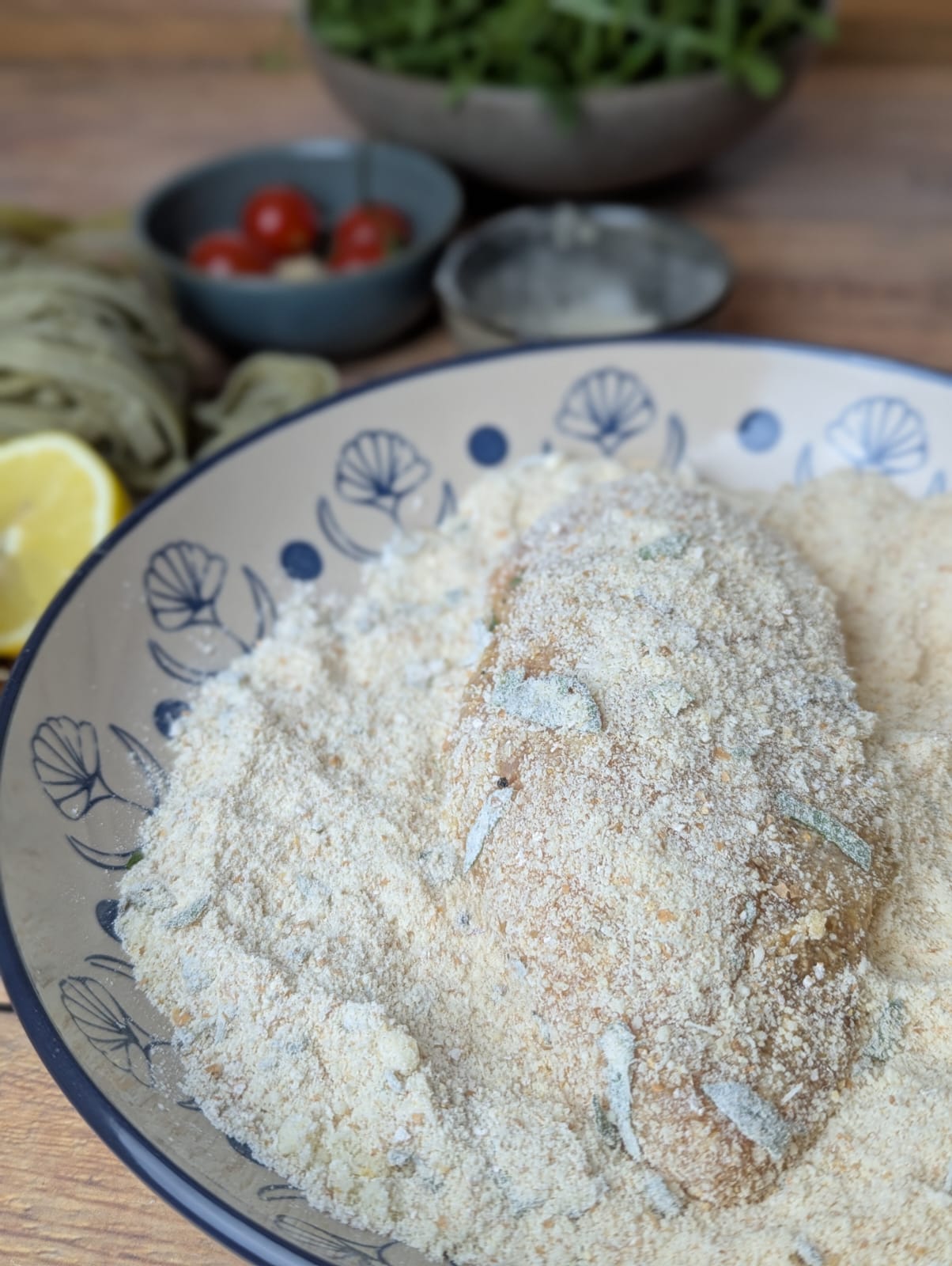 Parmesan, Hähnchen und Zitronensalbei, saftig mit knuspriger Kruste.