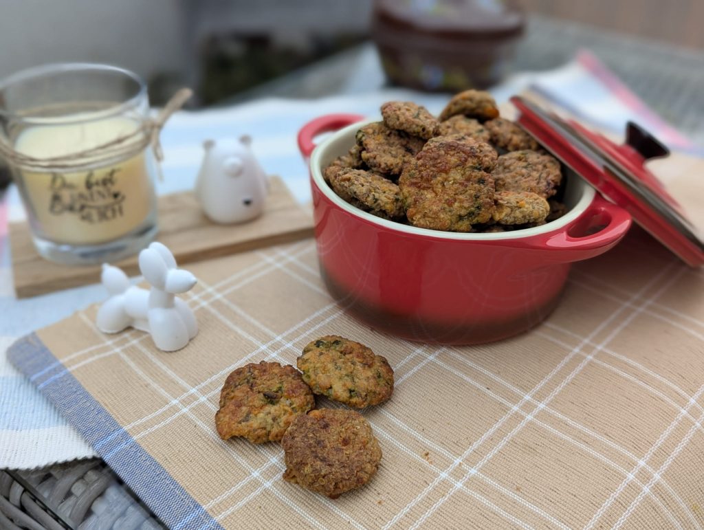 Alle Zutaten zusammen in eine Schüssel geben. Die Möhre fein raspeln. mische sie gut durch, entweder mit dem Knethaken oder knete die Masse mit den Händen. Der Teig ist klebrig, aber lässt sich gut zu Kugeln formen. Belege nun ein Backblech mit Backpapier und forme aus dem Teig ungefähr 60 Kugeln mit etwa 1,5cm Durchmesser, die du dann flach auf das Backpapier drückst. Du brauchst dabei keinen großen Abstand einhalten, da die Hundekekse nicht aufgehen. Backe sie anschließend, je nach Größe 20-25 min bei 180° Umfluft im Backofen.