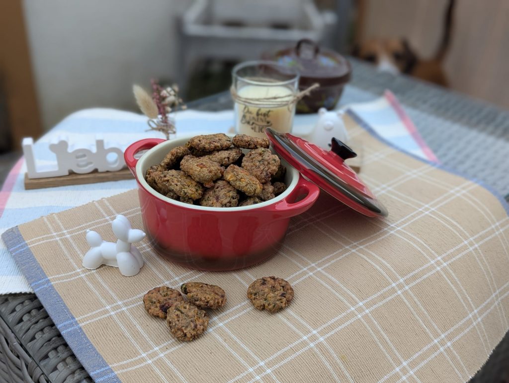 Ein Leckerli ohne Konservierungsstoffe , zusätzlichen Zucker und anderen ungesunden Zutaten, auch für empfindliche Hunde gut geeignet. Die Hundekekse sind länger haltbar, wenn man sie nach dem backen noch richtig trocknen lässt. Mein Hund hat Probleme mit seiner Bauchspeicheldrüse, besteht aber auf seine Leckerlies. Deswegen mache ich sie selbst und die Fellnase ist umso glücklicher, denn er verträgt sie super.