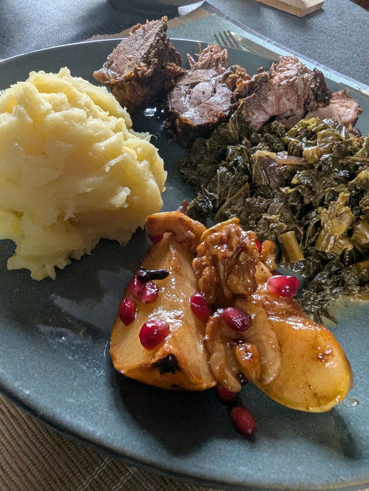Diese süße, zimtige Beilage habe ich zu Weihnachten einfach mal probiert, es gab Wildschweinrücken und irgend etwas fehlte mir da noch. Ich hatte Birnen zuhause, einen saftigen Granatapfel und mein Walnussbaum bescherte mir im Herbst eine reiche Ernte. Ahornsirup war auch noch im Kühlschrank und schon hatte ich das gewisse, besondere Etwas zu meinem Wildbraten. Seit dem ich dieses Rezept das erst mal gemacht hatte, gibt es keinen Wildbraten mehr ohne diese leckere Zugabe. Letztes Weihnachten gab es dazu Rehkeule und Klöße, das passte sogar noch besser als zu Wildschwein.