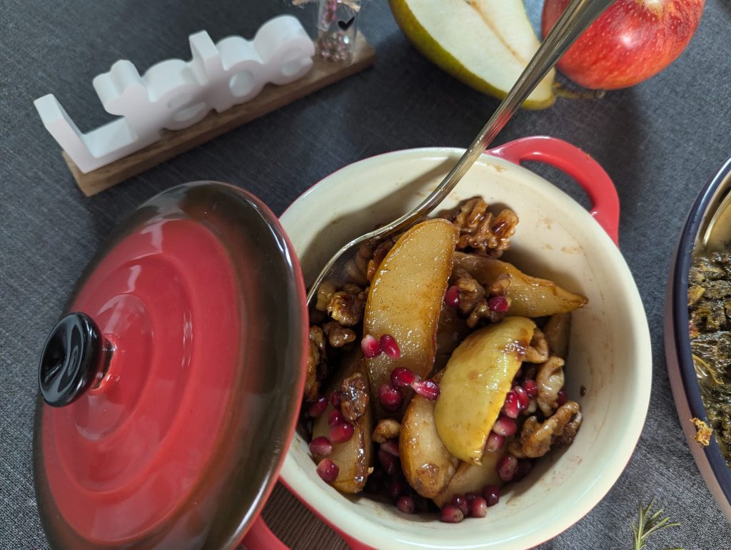 Schlagwörter: Walnuss, Beilage zu Wild, Birnen, karamellisiert, Zimt, Ahornsirup
