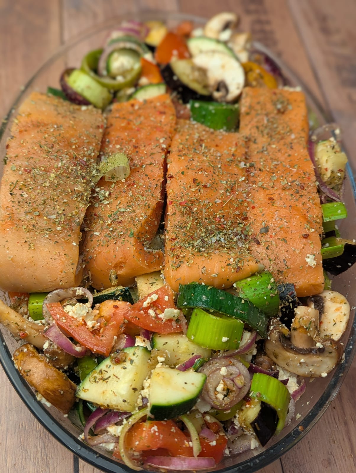 Jetzt in der Auflaufform mittig im Gemüse eine Kuhle formen und den Lachs hineinlegen, sodass er schön vom Gemüse umschlossen ist.