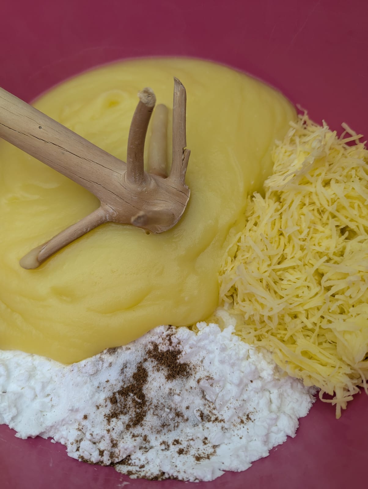 Jetzt machen wir drei Haufen. Der eine ist unser Stärkemehl, auf dem einen halben Teelöffel Salz und einen viertel bis halben Teelöffel Muskat streuen. Der nächste ist unser ausgepresster Kartoffelschab. Der dritte ist unser kochend heißer Kartoffelbrei. Vorsicht, hier verbrennt man sich leicht, denn er blubbt gern noch nach.