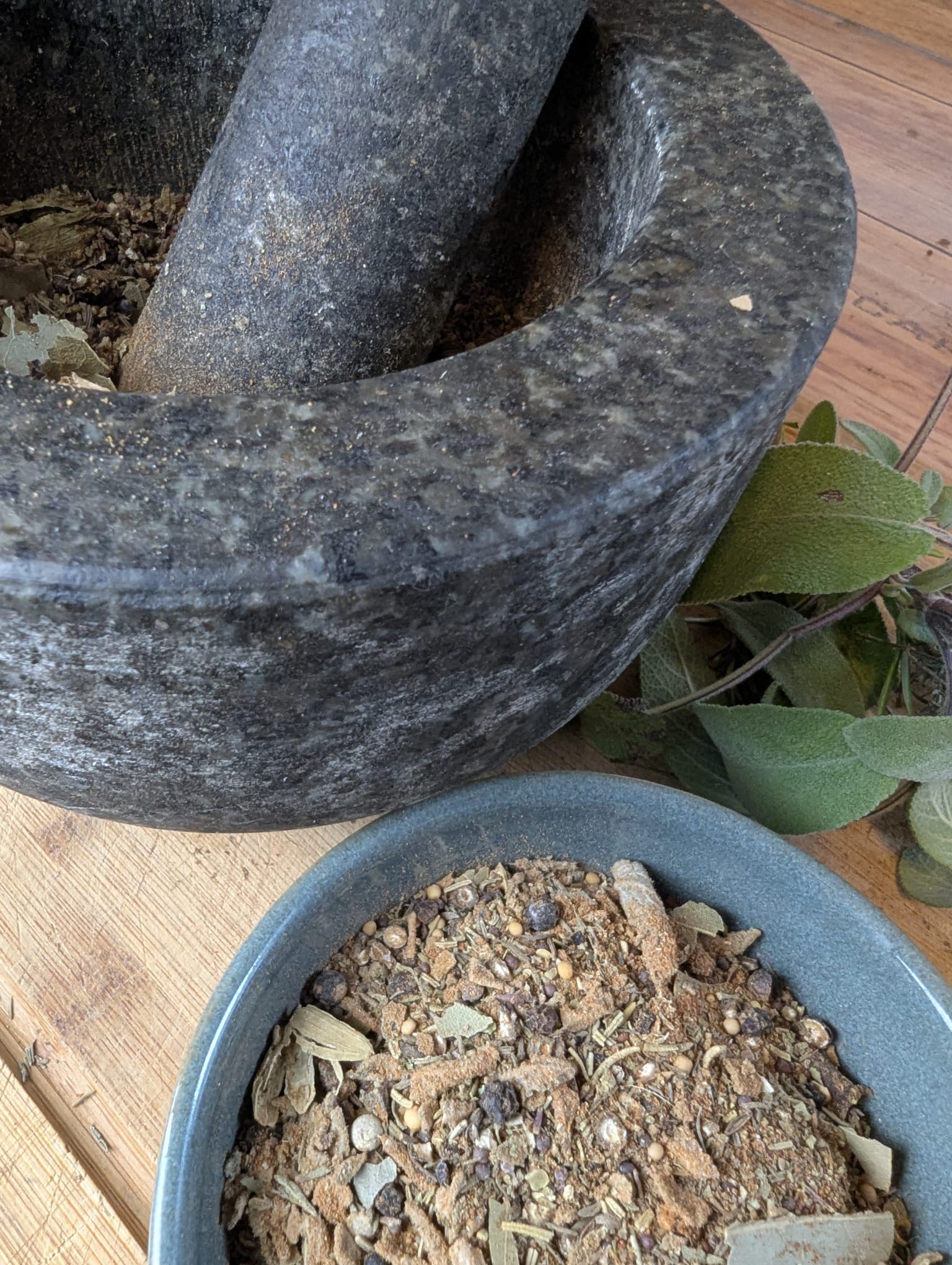 Als erstes alle größeren Körner, Beeren und Kapseln in einen Mörser geben und zerstoßen, bzw kleiner reiben, sodas die Kardamomkapseln, Wacholder, Pfefferkörner, Pimentkörner aufplatzen. Dann Senfkörner und Kümmel dazu geben und nochmals verreiben. Jetzt kommen die Salbeiblätter, Thymian und Lorbeerblätter. Nochmals zerreiben bis die Lorbeerblätter in kleine Stücke zerfallen. Am Schluss die verschiedenen Pulvergewürze dazu geben und alles gut vermengen.